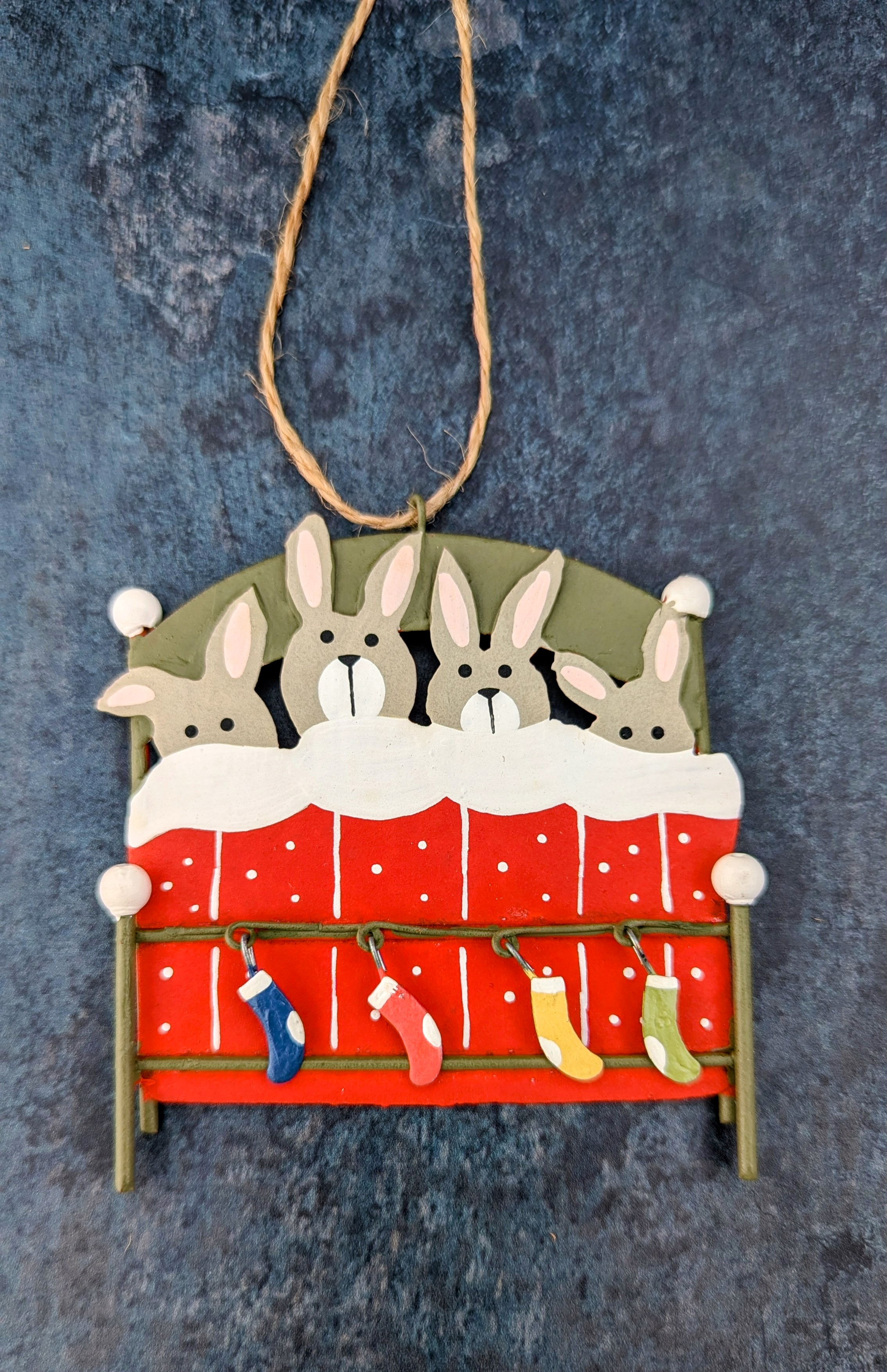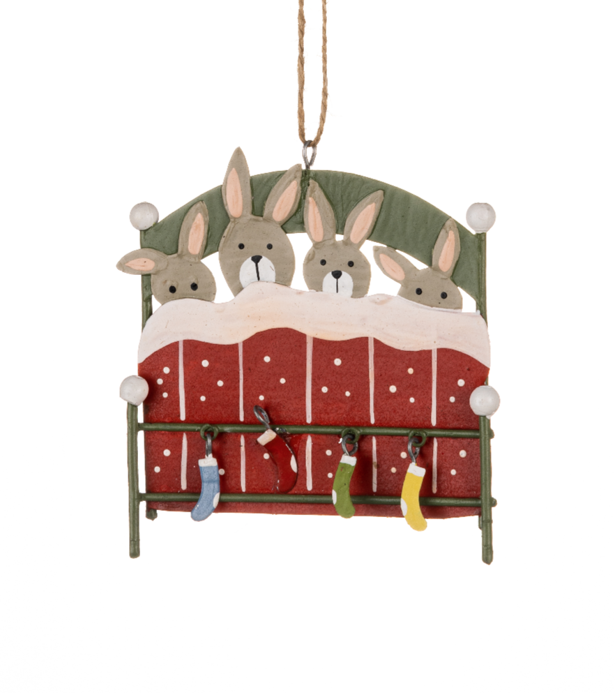 Adorable hanging ornament depicting four little bunnies tucked up in bed under a red blanket and having 4 little shivering socks suspended from the bed frame.