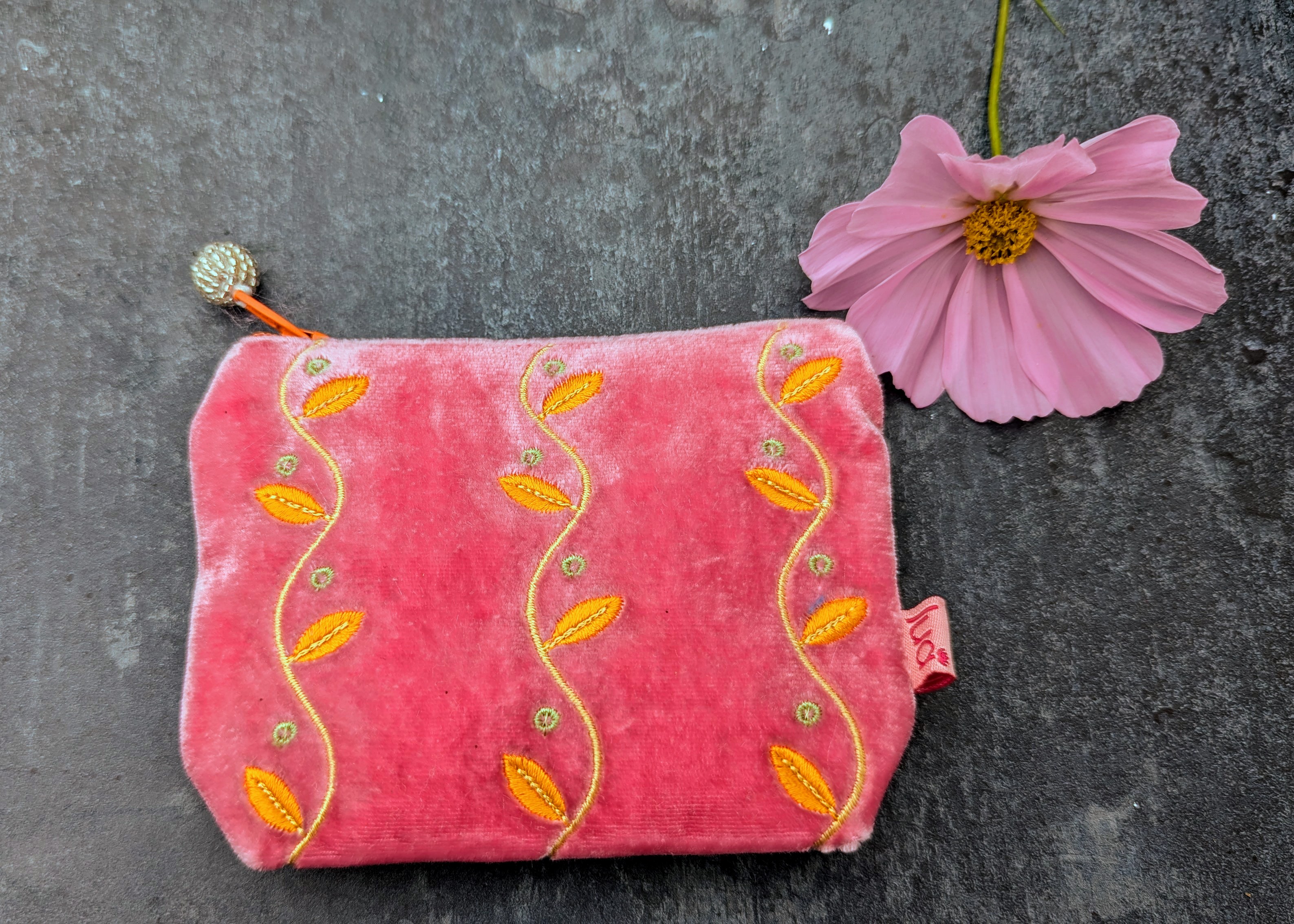 A soft velvet coin purse in candy floss pink, embroidered with vines of orange leaves and having a complementary orange zipper with beaded zip pull.