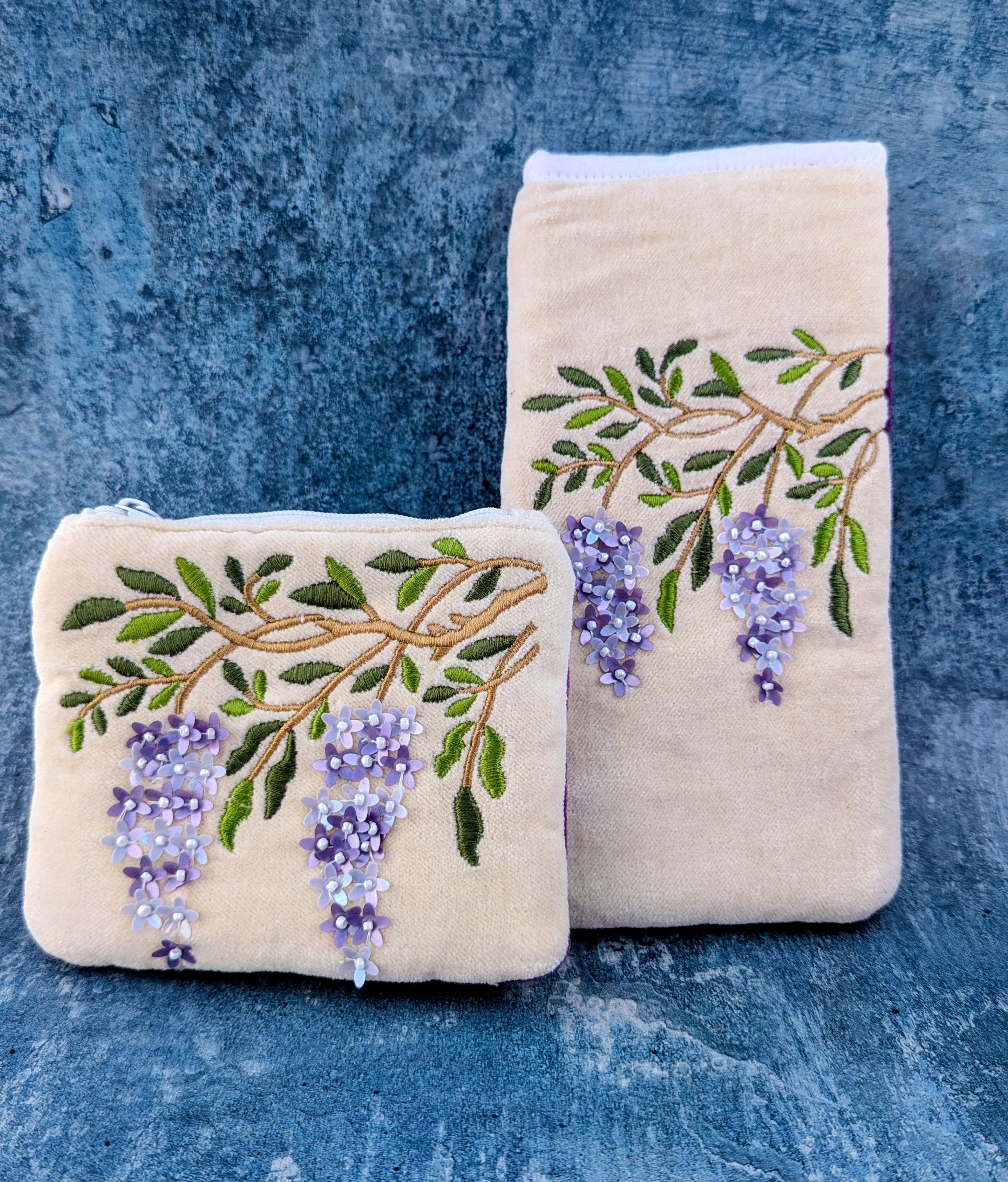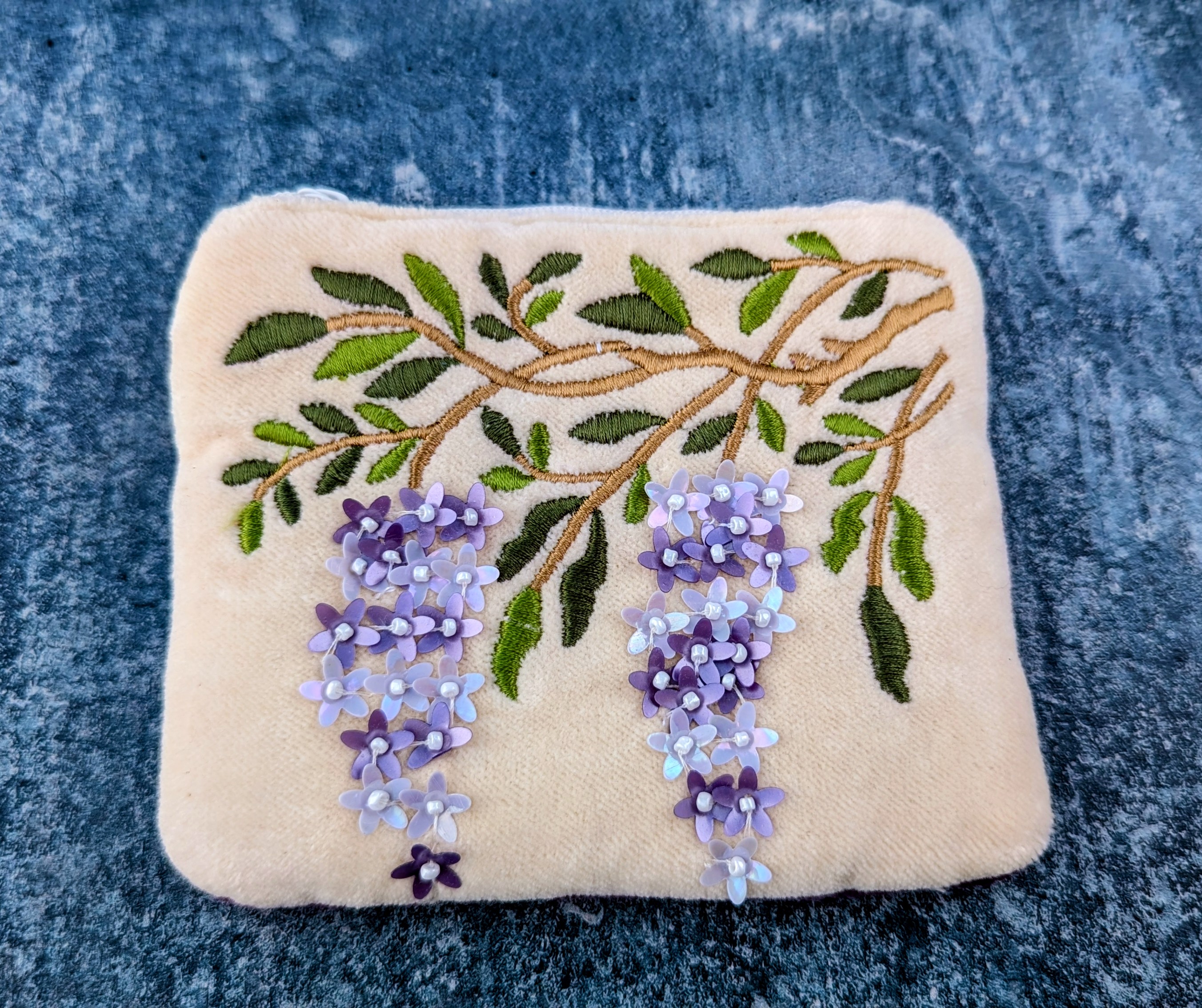 Crafted from soft cotton velvet and adorned with finely embroidered branches and cascading wisteria blooms, this purse captures the graceful beauty of wisteria in full flower. Shimmering floral sequins and tiny bead details create soft clusters of lilac coloured blossoms that gently drape across the design, adding texture, depth and a subtle sparkle.
