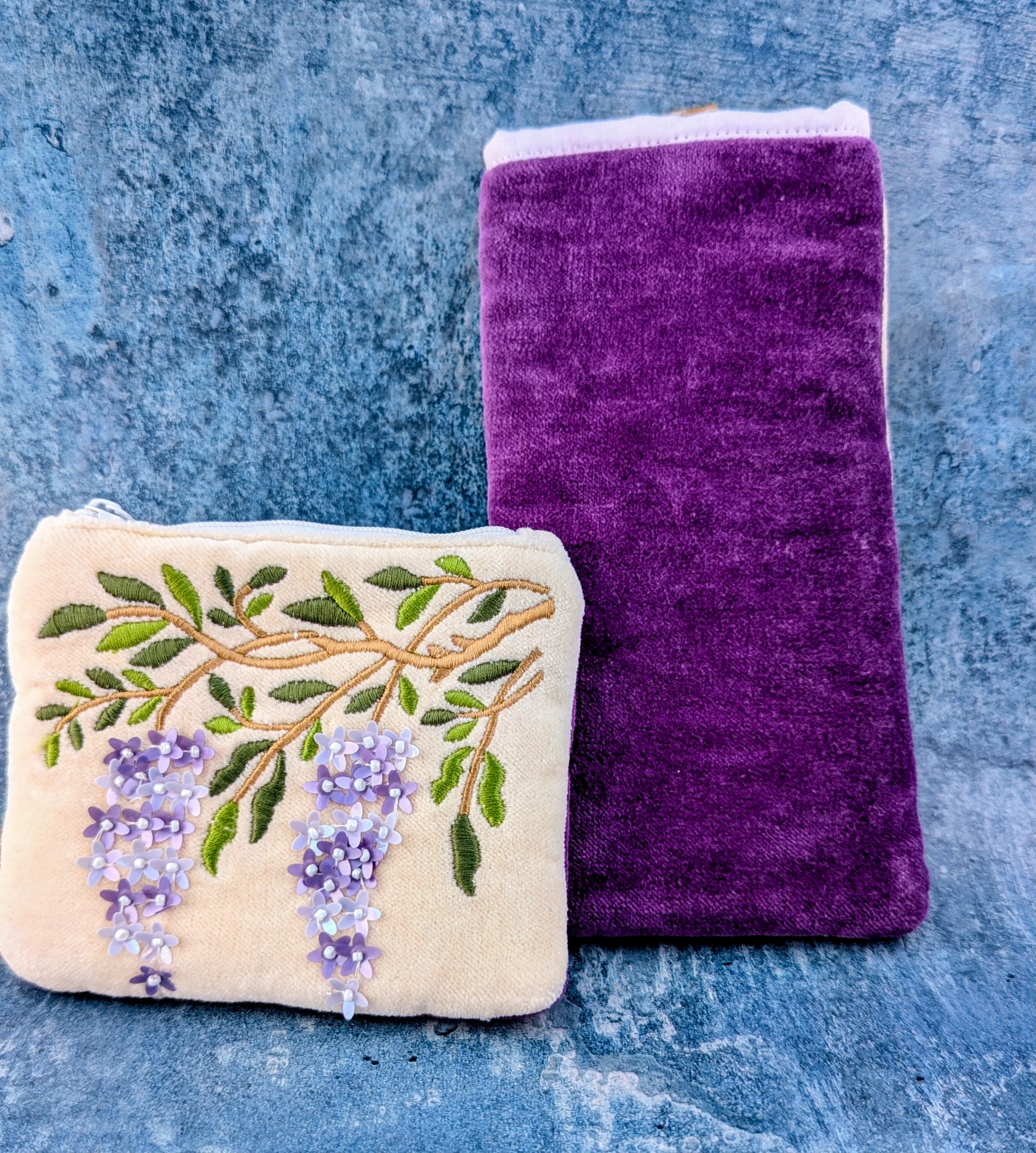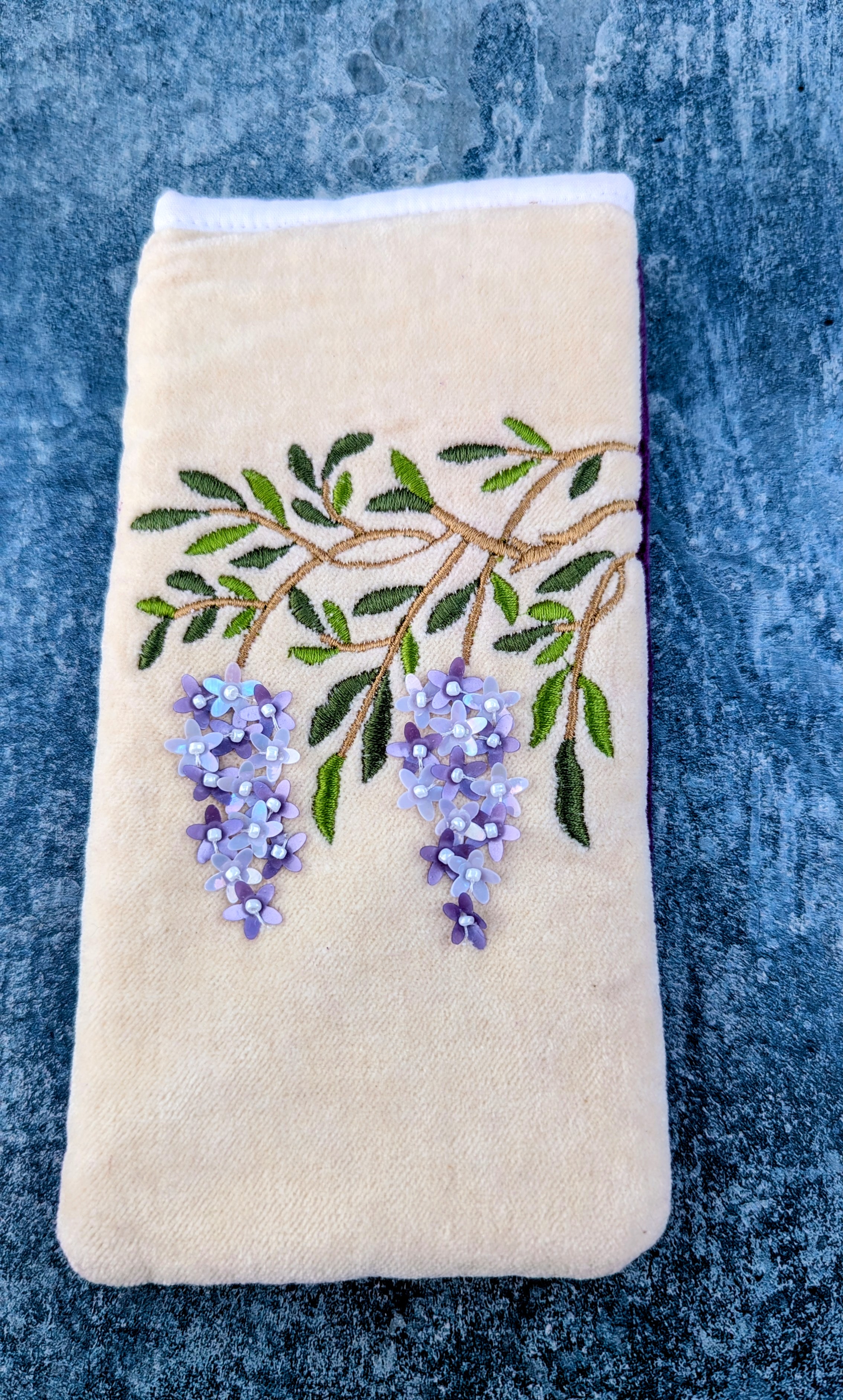 Crafted from soft cotton velvet and decorated with finely embroidered branches and cascading wisteria blooms, this case captures the graceful beauty of wisteria in full flower. Clusters of lilac-toned floral sequins and delicate bead accents create softly draping blossoms, adding texture, depth and a gentle shimmer to the design.