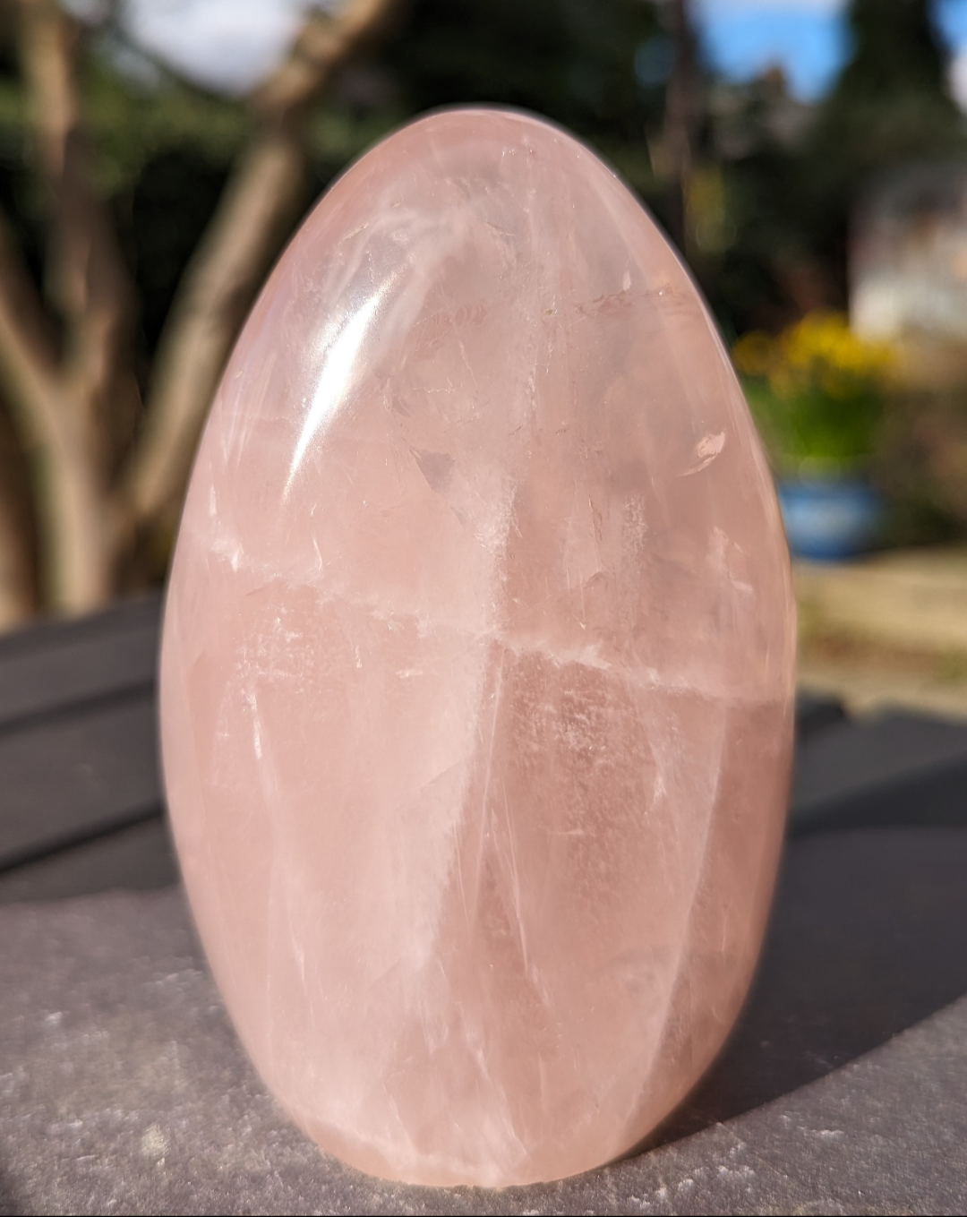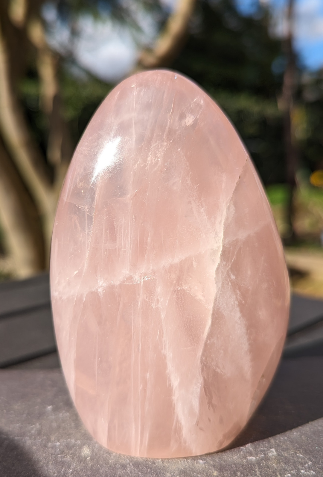 An absolutely gorgeous pink with some really interesting "fractures" (natural formations within the crystal" and rainbows.