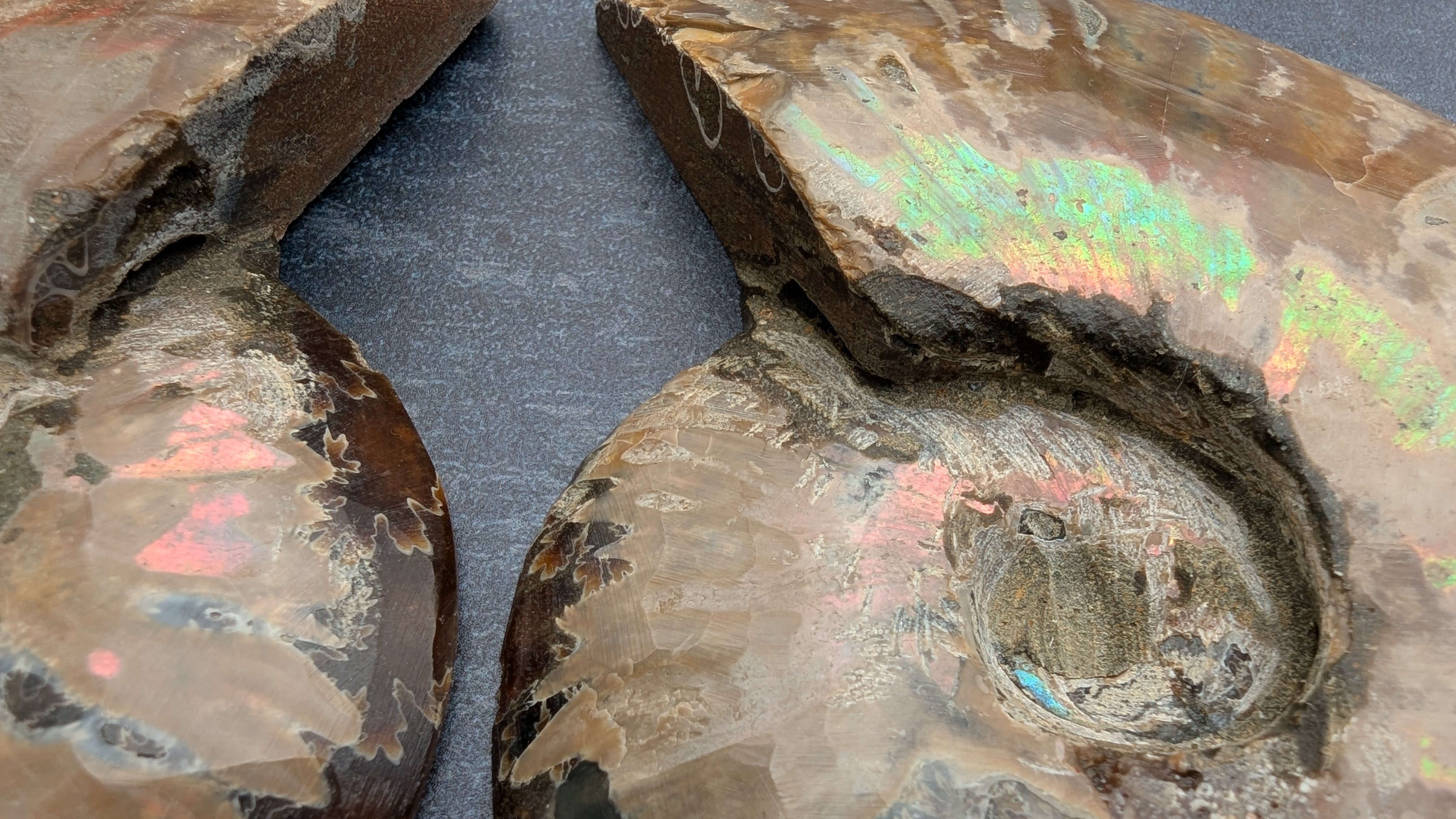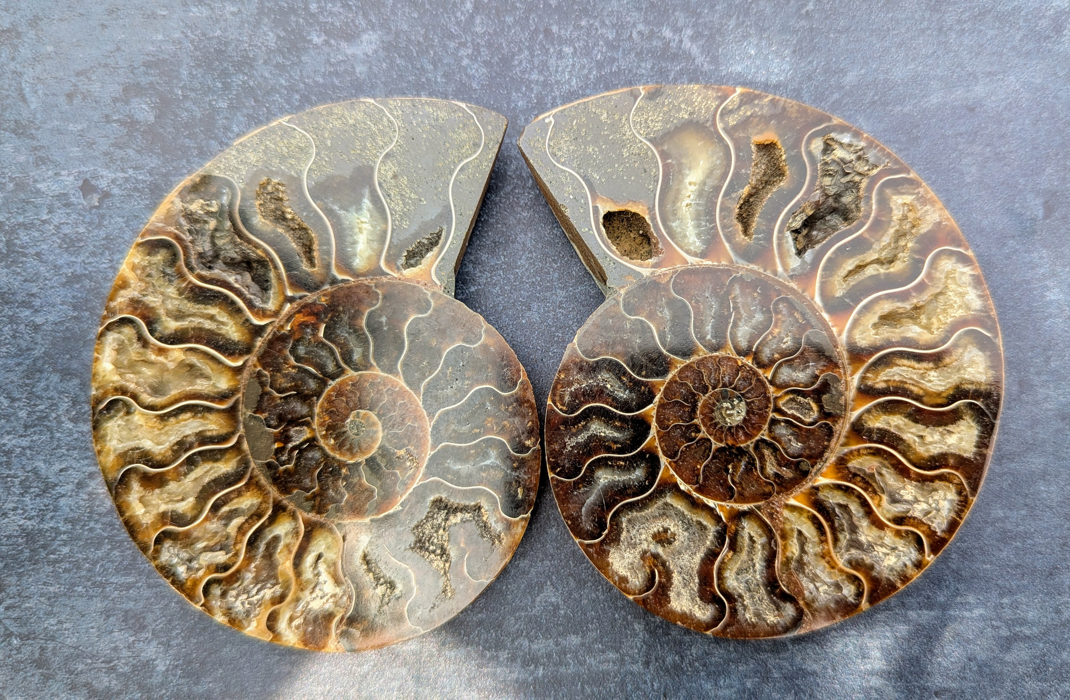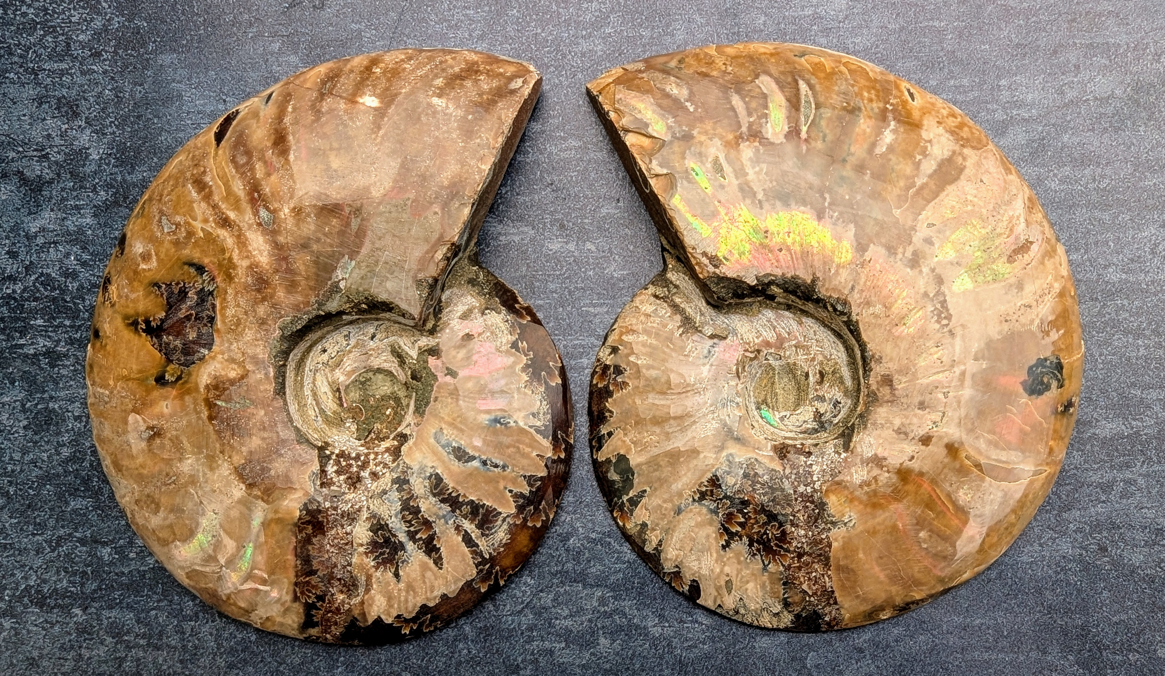 A lovely, dark, cut and polished ammonite with some fascinating nacre layers on its outer surfaces. Lots of crystals caves in this wonderful piece.